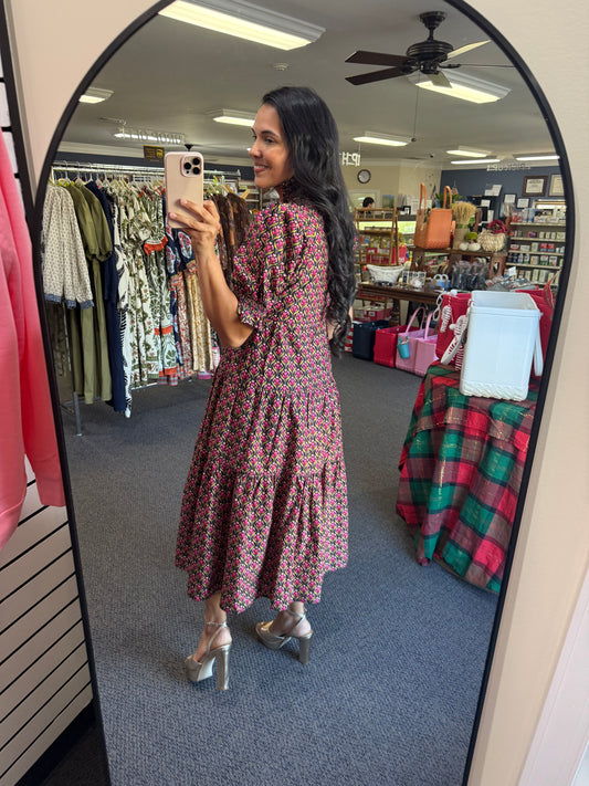 Botanical Print Dress in Black with Contrast Trim Split Neck