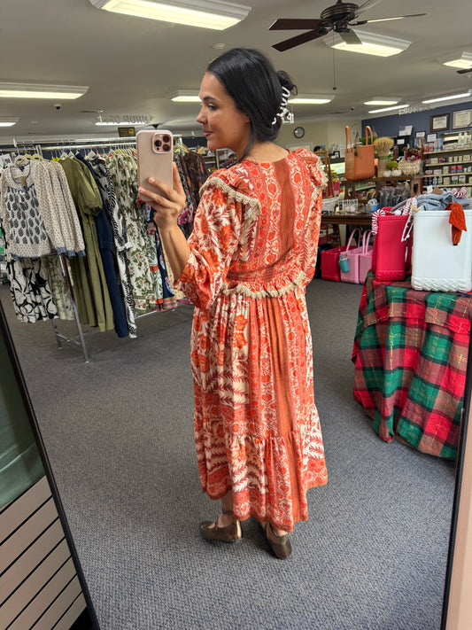 Mixed Floral Print Midi Dress with Peplum in Orange
