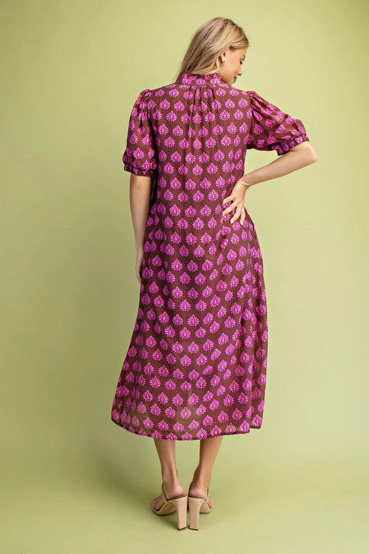 Brown Mix Midi Dress with Purplish-Pink Designs