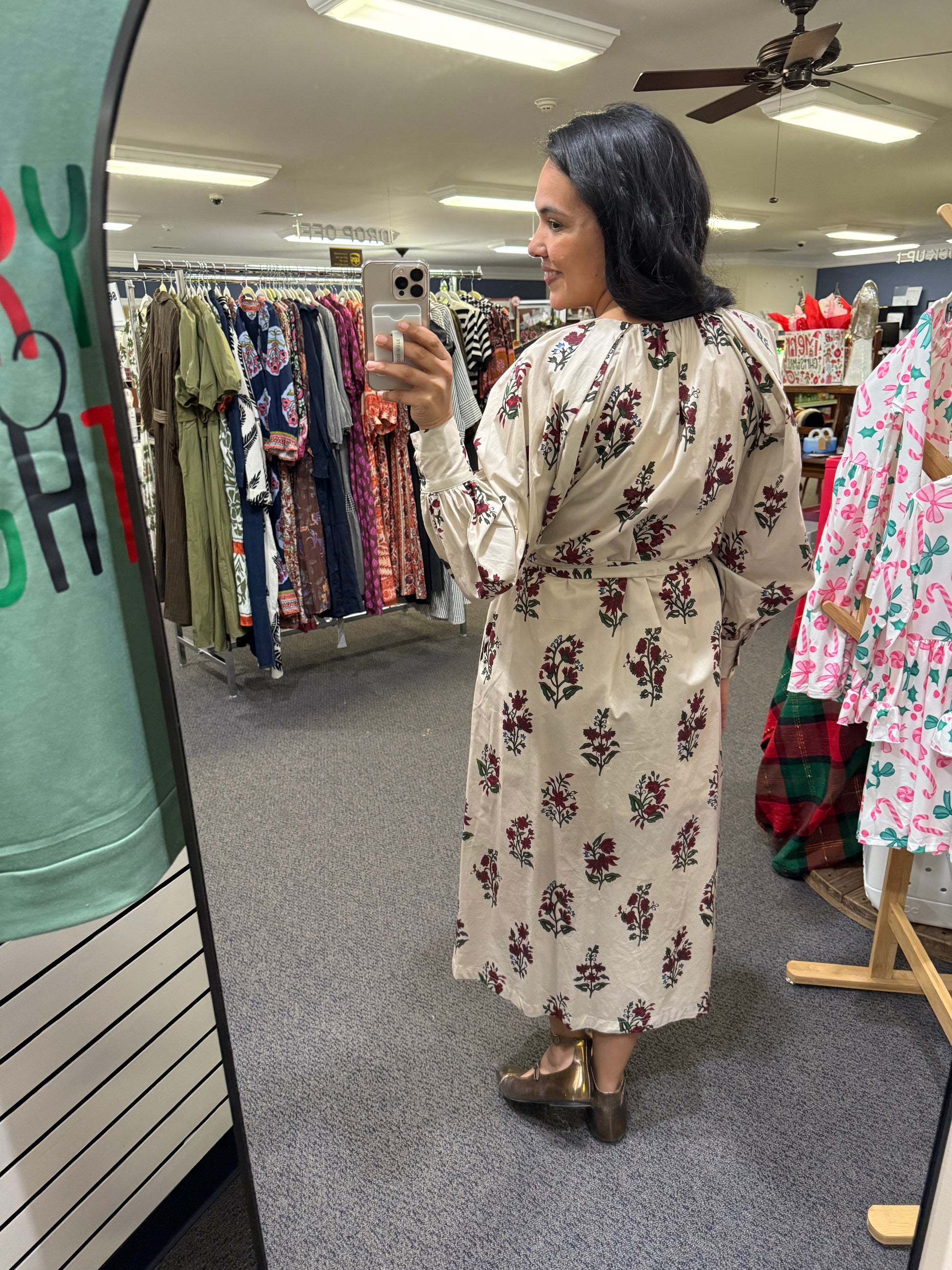An amazing dress in ivory with clusters of burgundy floral details. The pleating around the neckline is the wow of this dress. The way the pleats emphasize the sleeves are spectacular, not to mention the actual full sleeves with cuffs. The dress has a zipper front closure, a self tie at the waist, and pockets! This dress is lined and made with exquisite quality.