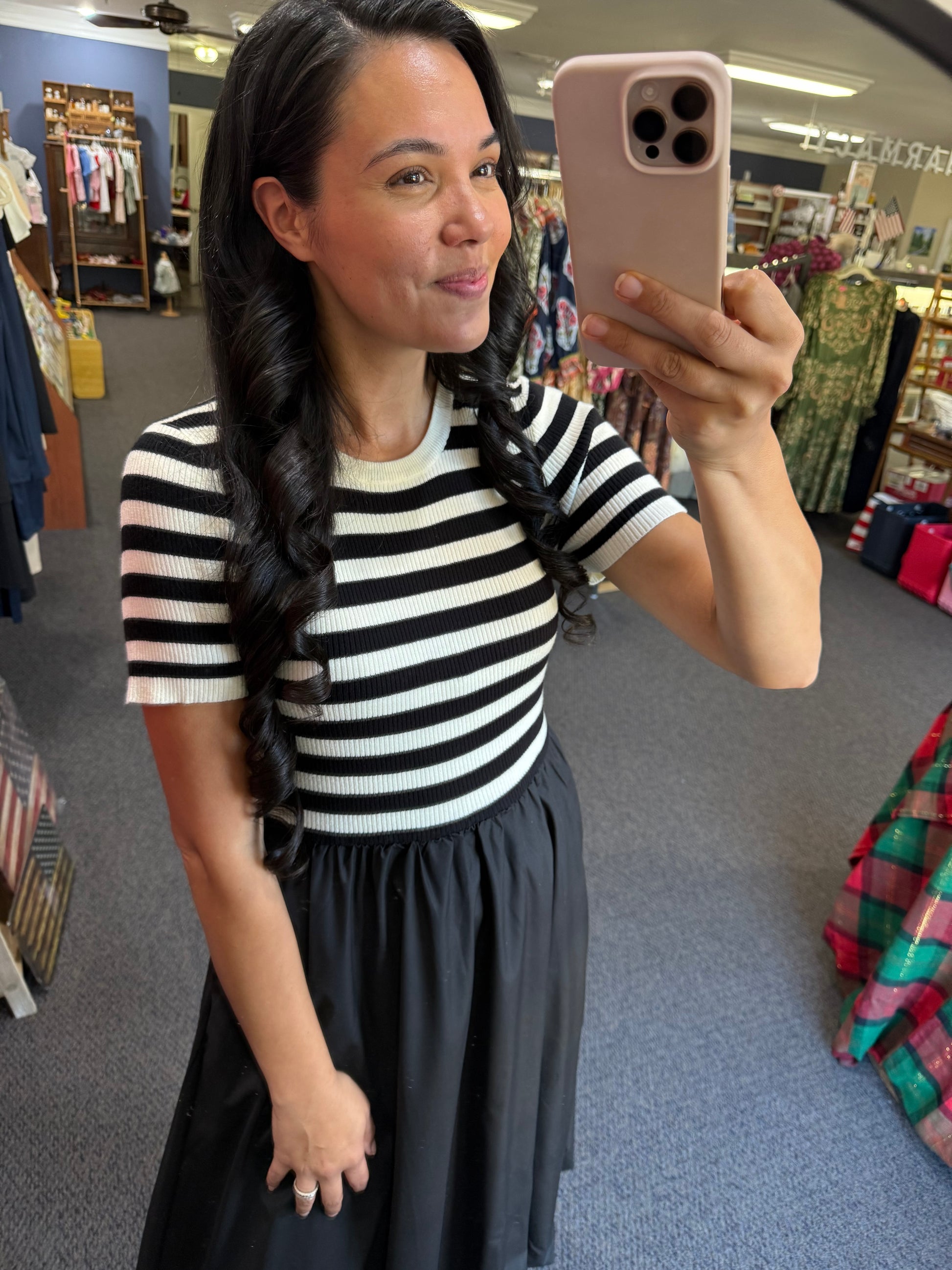 A fun, chic take on a staple b&w striped look! The striped ribbed knit top paired with the bubble skirt makes this look an absolute YES!