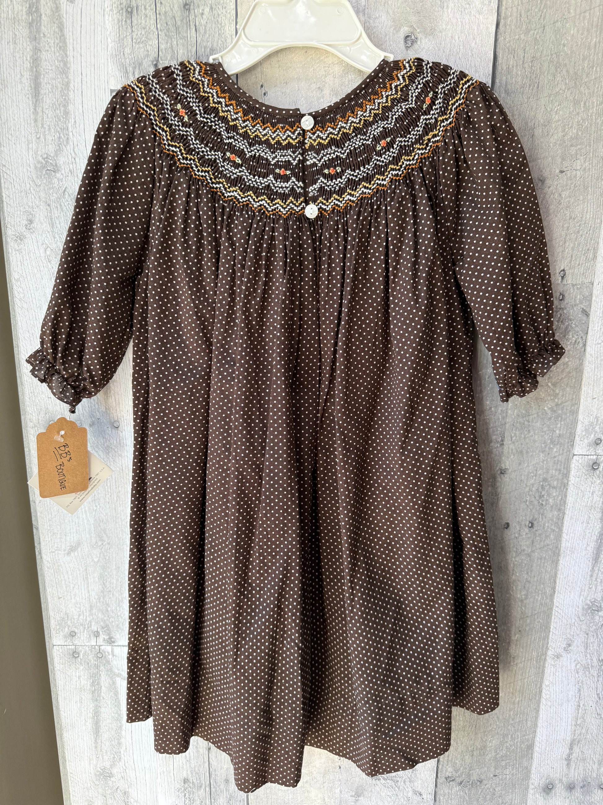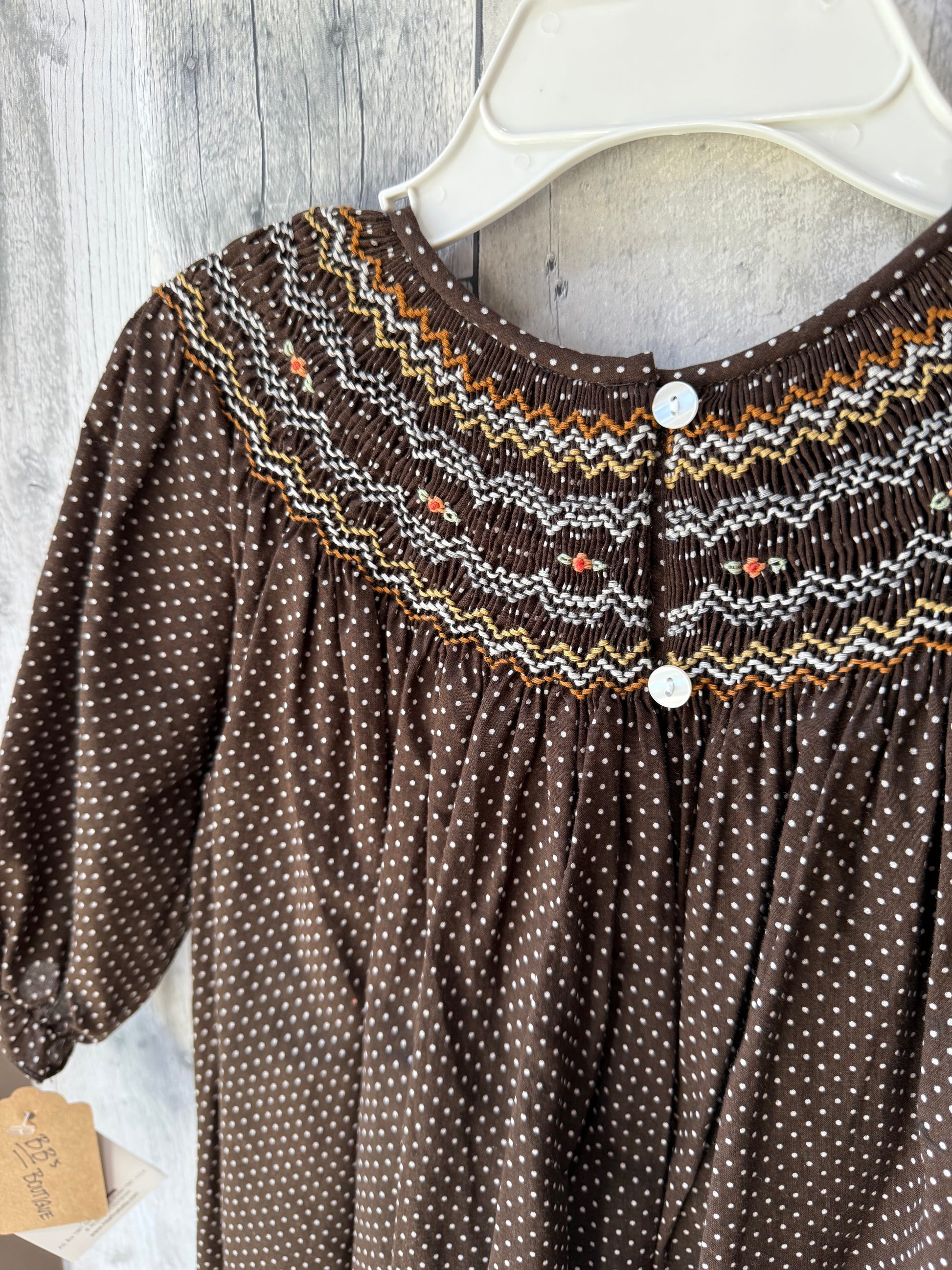 Toddler Girls Bishop Smocked Micro-Polka Dot Long sleeve dress // Brown & Orange Embroidered Detail